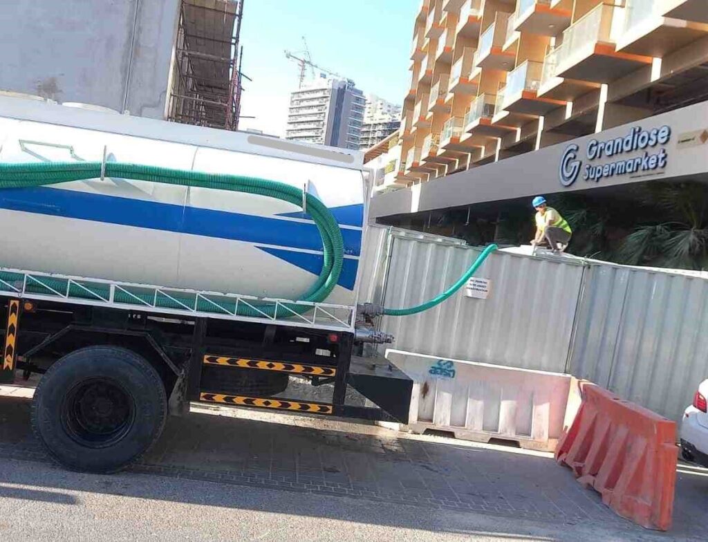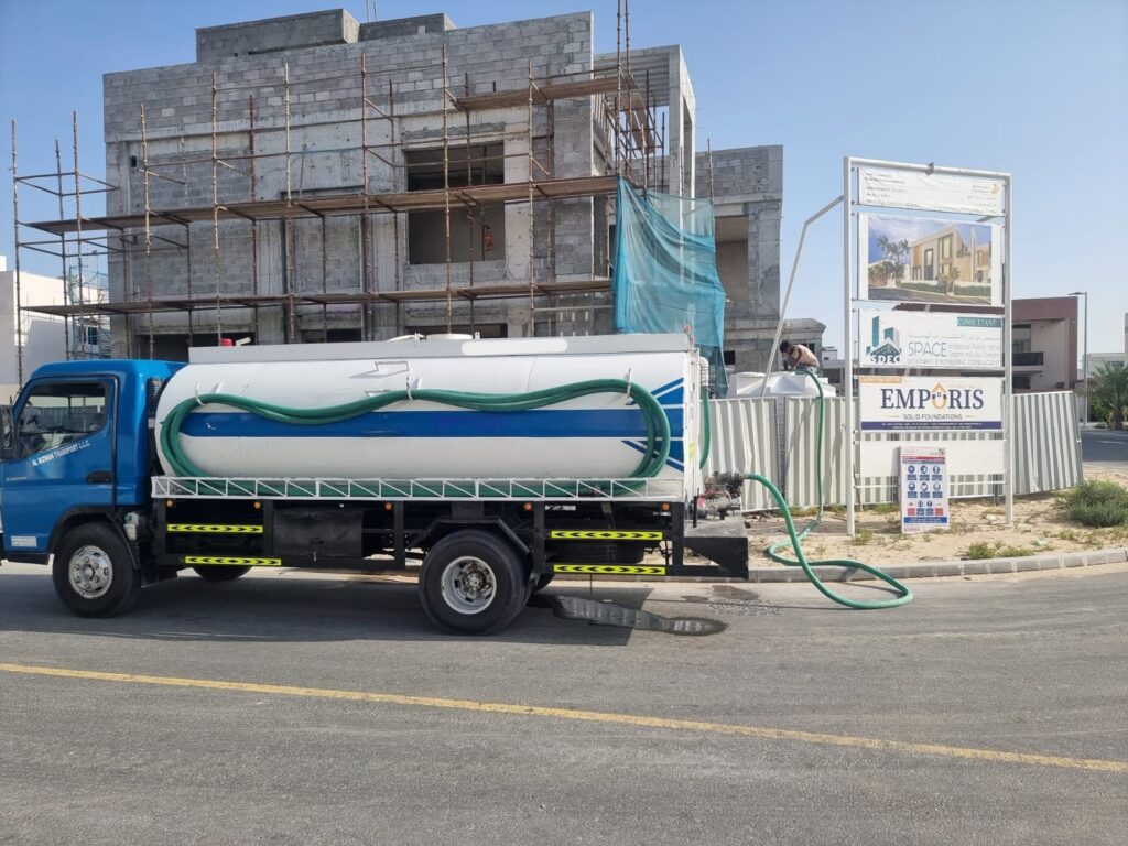 Salt water tanker supply for construction sites in Dubai, ideal for building work, cleaning, and industrial operations.